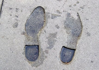She said she would dodge the traffic and stand in the gap to take a more distant shot of the house with me in front of it. I reluctantly agreed as I would not be seen close up. I am so glad I did. As I stood on the sidewalk I happened to look down and right at my feet was the outline of a bare foot, drawn in concrete when it had been wet. Even the toes were neatly drawn. In the centre